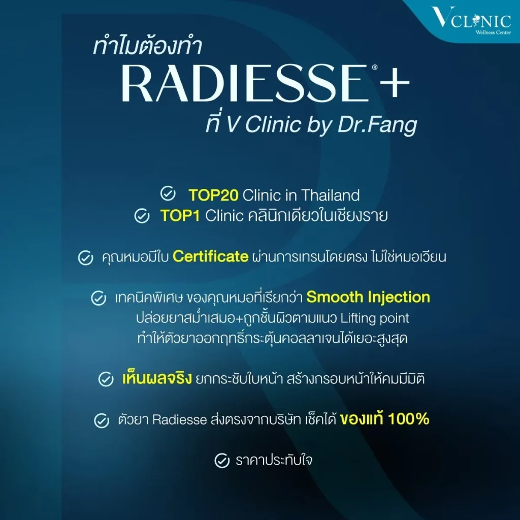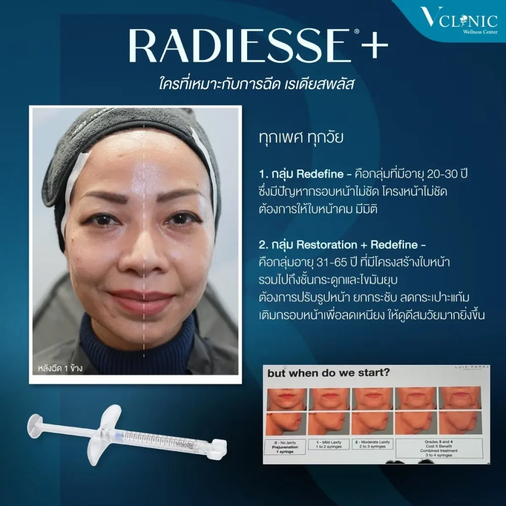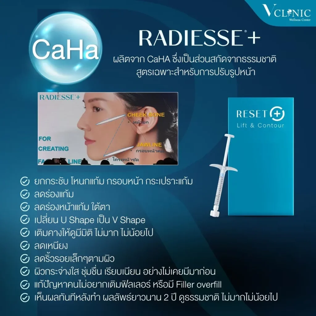 โดย Radiesse plus จัดอยู่ในกลุ่ม NON-Surgical Cheek and Jawline Lifting and Contouring Injection หรือสารฉีดหรือสร้างกรอบหน้า และยกกระชับใบหน้าโดยไม่ต้องผ่าตัด ให้ผลลัพธ์คือการเติมเต็ม ปรับกรอบหน้าให้ชัด โครงหน้ามีมิติ และแก้ไขข้อบกพร้องของผิวแบบระยะยาวอย่างกึ่งถาวร ด้วยส่วนประกอบหลักคือ CaHA microsphere และ Sodium Carboxymethylcellulose ที่มีอยู่แล้วในร่างกายของคนเรา เป็นสารฉีดที่ใช้มาอย่างยาวนานมากกว่า 20 ปี และงานวิจัยรองรับมากกว่า 750 ฉบับ ผ่านทั้ง Thai, EU, US FDA หมดห่วงเรื่องความปลอดภัยได้เลย