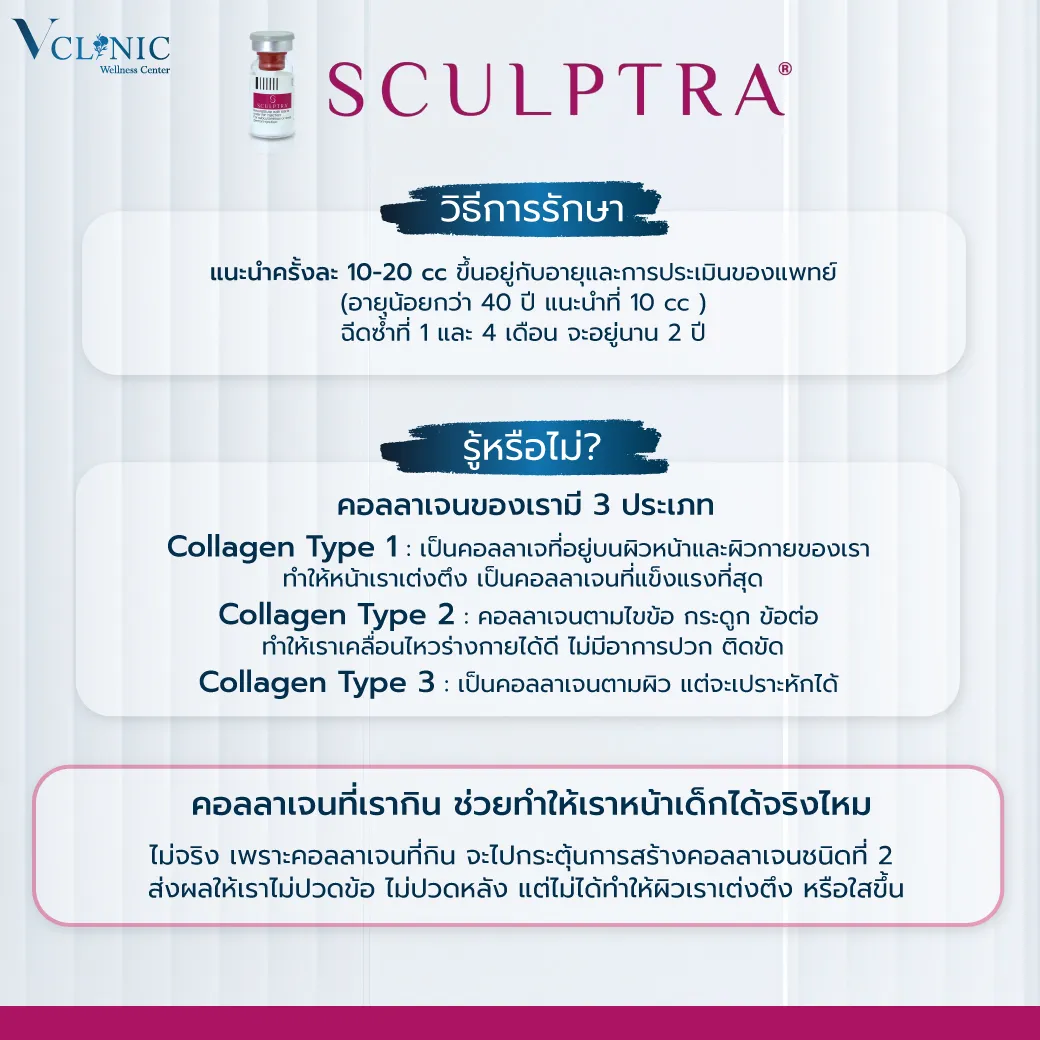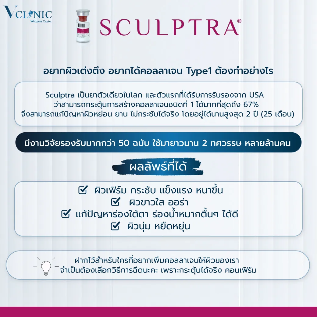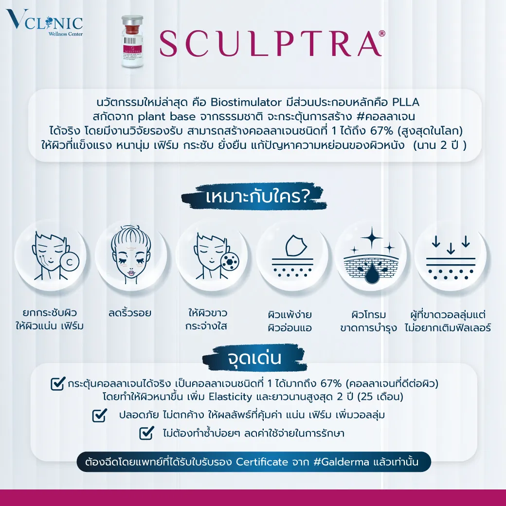 สุดยอดนวัตกรรมจากอเมริกาที่ได้รับการยอมรับว่าสามารถกระตุ้นการสร้างคอลลาเจนได้จริง ให้ผิวเด็ก ผิวใส หน้าเงา เพิ่มความยืดหยุ่น ไม่โย้ย หย่อน ผ่าน USFDA , ThaiFDA ตัวแรกของโลก อยู่นาน 2 ปี Sculptra